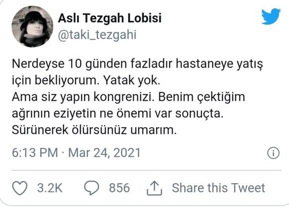 Ne acı ama ya. Böyle bir ihmal olabilirmi. Tweet baya acı son ile bitmiş. Kongrelere tepki çok. Azalacak gibi de durmuyor. Vatandaşa da hak vermek lazım bir yerde. Aslının şuan olduğu yer eminim dünyadan daha güzeldir. Mekanı cennet olsun inşallah.