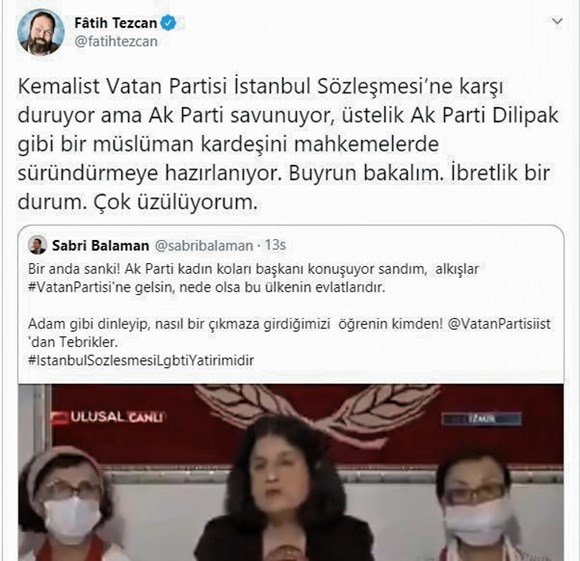 Tezcan, AKP Kadın Kolları'nın suç duyurusunda bulunduğu Yeni Akit Gazetesi yazarı Abdurrahman Dilipak'a destek çıktı. Daha önce Atatürk'e ettiği hakaretlerle bilinen Fatih Tezcan, bu kez İstanbul Sözleşmesi'ni savunanlara sosyal medya hesabı üzerinden küfür etti.