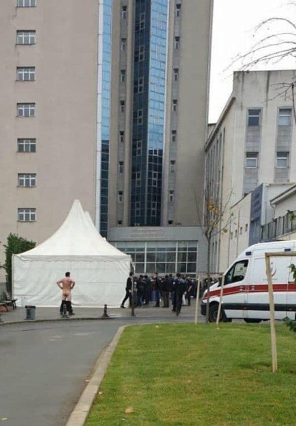 Mersin Üniversitesi Hastanesi önünde oluşan Covid-19 kuyruğunu protesto eden bir vatandaş çıplak bir şekilde sıra bekledi. Uygun foto değildir. Devamına basmadan önce düşünün