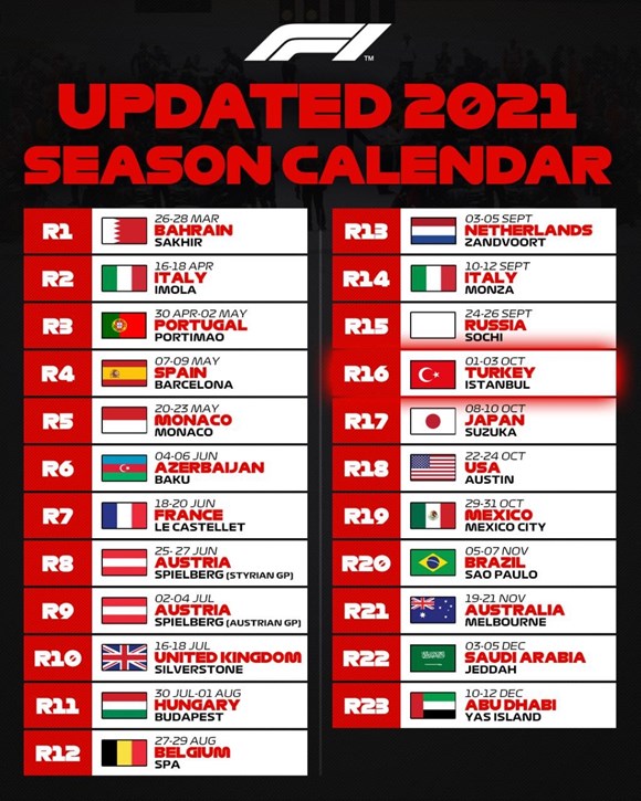 Türkiye'nin Formula 1 hasreti sona eriyor ve İstanbul Park yeniden Formula 1'e kavuşuyor. Yapılan açıklamaya göre 13-15 Kasım 2020 tarihlerinde Formula 1 yarışları İstanbul'da yapılacak. İstanbul Park'ta ilk kez 2005'te gerçekleştirilen Formula 1, ülkemizde 2005 – 2011 yılları arasında düzenlendi. Formula 1 yarışları, 9 yıl aradan sonra Türkiye'de tekrar yapılacak.