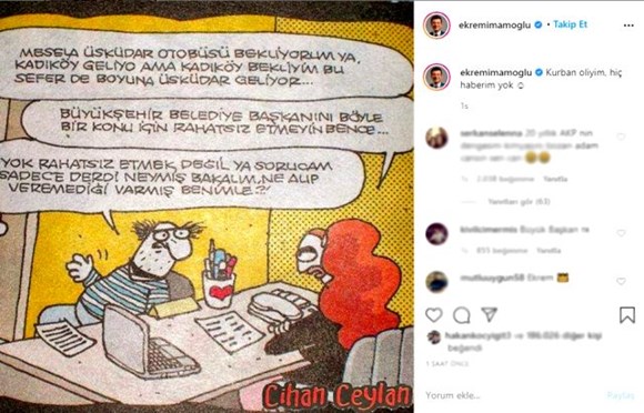 Ekrem İmamoğlu, otobüs bekleyenlerin İBB'ye yönelik isyanını anlatan bir karikatürü sosyal medya hesabından paylaştı. İmamoğlu, paylaşımına "Kurban oliyim, hiç haberim yok" notunu düştü.