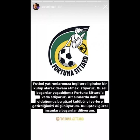 Acun ılıcalı hollanda liginden fortuna sittard takımına yatırım yapmıştı belki bilirsiniz sizde arkadaşlar. Sosyal medya paylaşımı ile veda etti kulübe ve ingiltere'den bir takıma yatırım yapacak. Adam king ya. Biz telefonda yada bilgisayarda futbol manager oyunu oynarız adam takım alıyor. Helal valla acun abi.