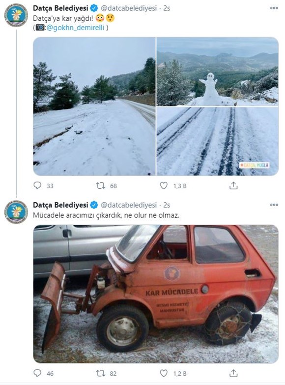Muğla ilimize bağlı Datçada kar yağışı oldu. Bu kar yağışı karşısında belediye yüzleri güldüren mücadele araçlarını hazır bulundurdu. Bunun dışında belediye başkanı kar yağması ile ilgili komik paylaşımda bulundu.