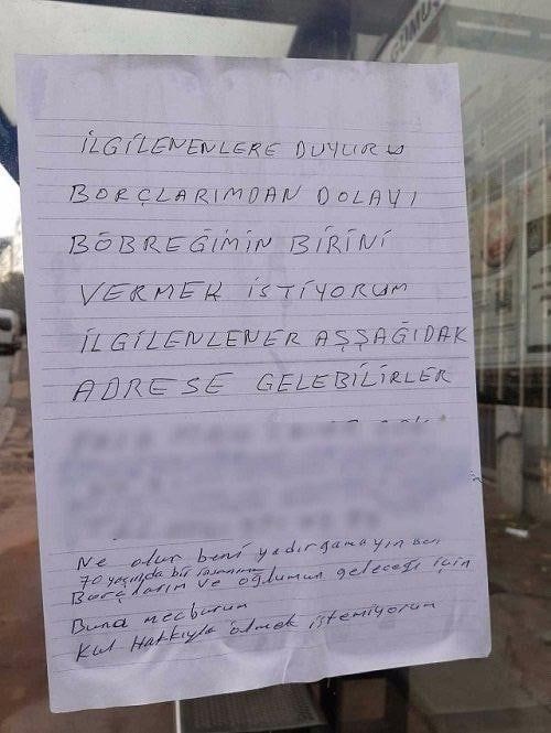 70 yaşındaki tesisat ustası karısı hastalanınca kredi çekiyor. Akabinde maaşına haciz konulmuş doğal olarak ödeyemeyince. Yaşlı adam böbreğini satılığa çıkarmış el yazısı ile ilanlar asıyor kul hakkı ile ölmemek için. Acı bir olay ama adam gibi adamsın amcacım. Kul hakkı ile ölmemek için böbreğini satılığa çıkarmış.