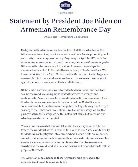 ABD Başkanı Biden, 1915 olaylarını "Soykırım" olarak tanıdı.