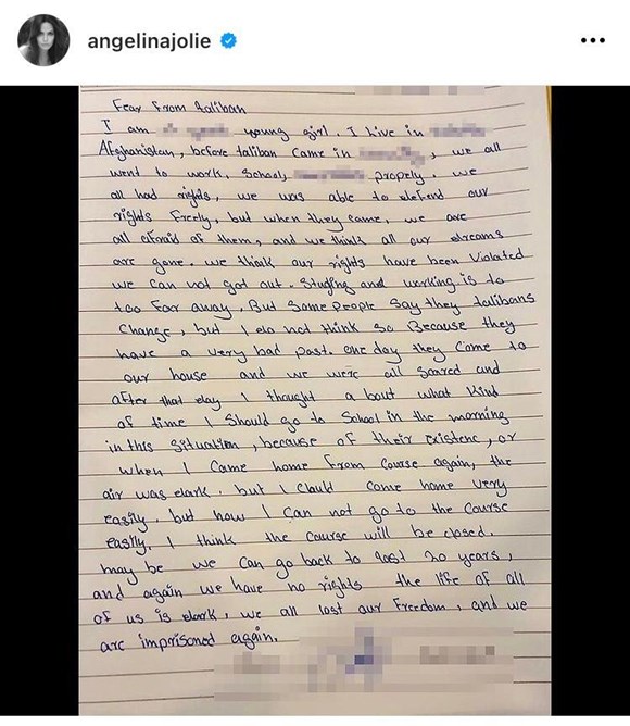Angelina Jolie, instagram hesabı açarak Afgan kızın kendisine yazdığı mektubu paylaştı ve Afganistan'daki duruma dikkat çekti. Jolie, Afgan mültecilerin yük gibi görülmesini de "mide bulandırıcı" olarak değerlendirdi.