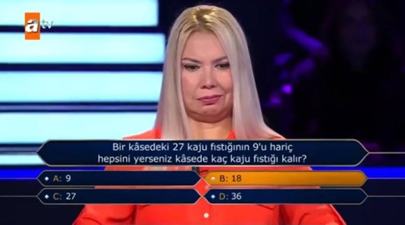 Temel bir türkçe matematik sorusudur, uzun yıllar ABD'de İngilizce'nin de etkisi olabilir. Anlamadığım nokta ise kendi başarılarından dakikalarca bahsedip 'turşu, soğan' ve benzeri cevaplı ilk sorularda hemen elenmeleridir. Hayatı dışarıda değil video ve kitaplardan mı öğreniyoruz sorusunu da akla getirmektedir.